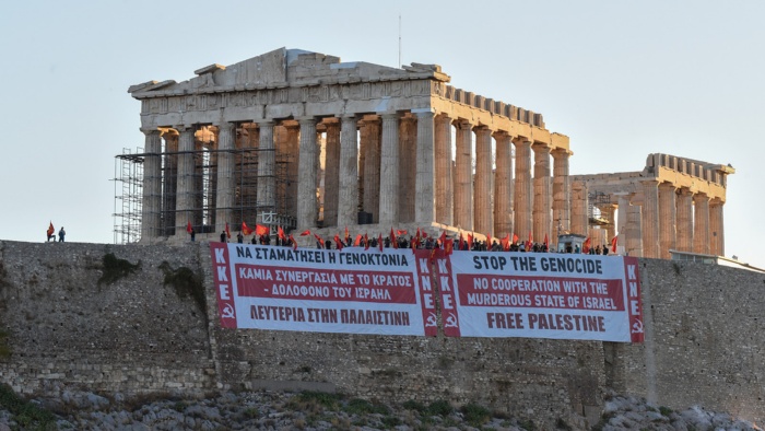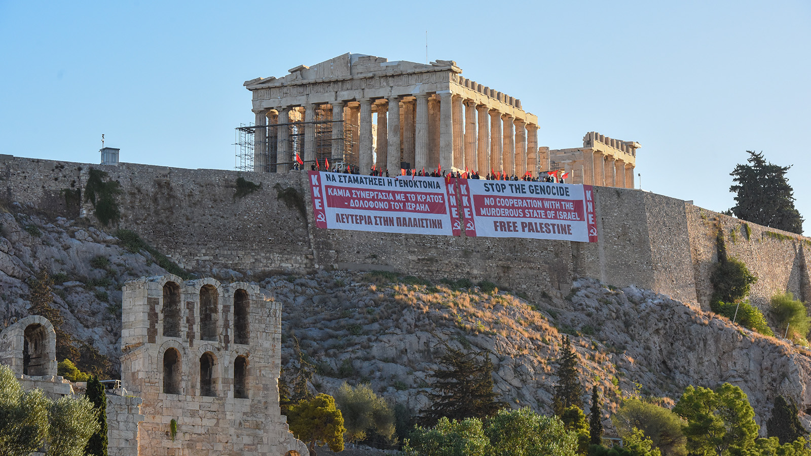 In a coordinated early-morning mobilization on 19 September 2025, members of the KKE and KNE scaled the Acropolis and unfurled two banners bearing messages in Greek and English: "Stop the genocide. No cooperation with the murderous state of Israel. Freedom for Palestine".