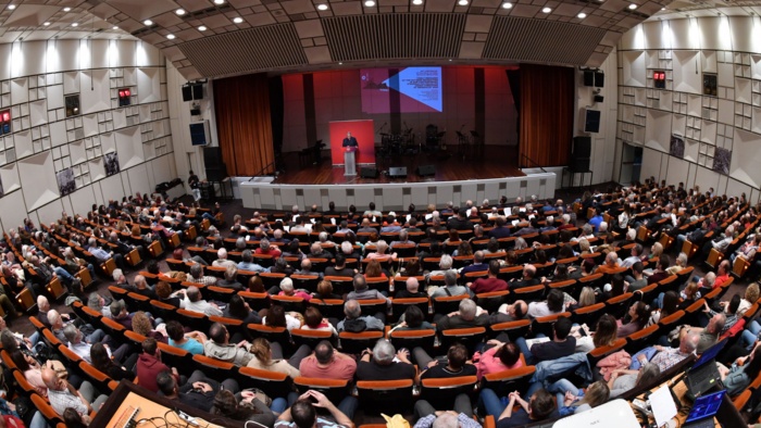 Con la firme convicción de que la Tierra al final será roja, de extremo a extremo, damos la bienvenida a los camaradas de las delegaciones de los partidos comunistas y obreros de Argelia, Argentina, Austria, Venezuela, Francia, Alemania, Dinamarca, EE.UU., Irlanda, España, Italia, Kazajistán, México, Países Bajos, Ucrania, Pakistán, Palestina, Paraguay, Rusia, Suecia, Turquía, Finlandia, que están hoy aquí con nosotros.